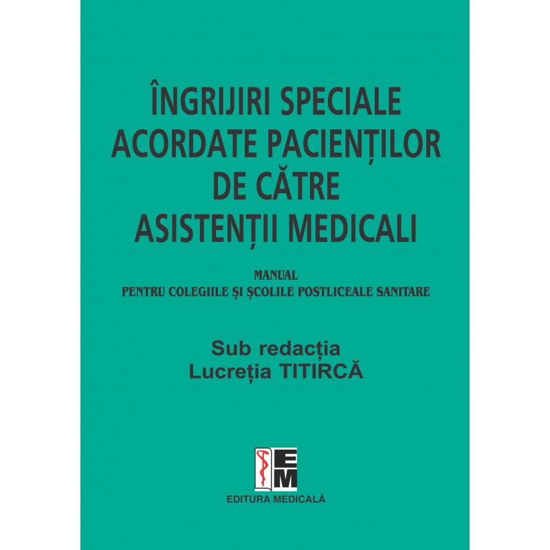 Îngrijiri speciale acordate pacienților de către asistenții medicali este de un real folos tuturor celor care se pregătesc pentru profesii medicale, studenților și elevilor din învățământul medical. Volumul scris de Lucreția Titircă - îngrijiri speciale acordate pacienților de către asistenții medicali este unul din cele mai des folosite manuale în domeniul nursingulu.